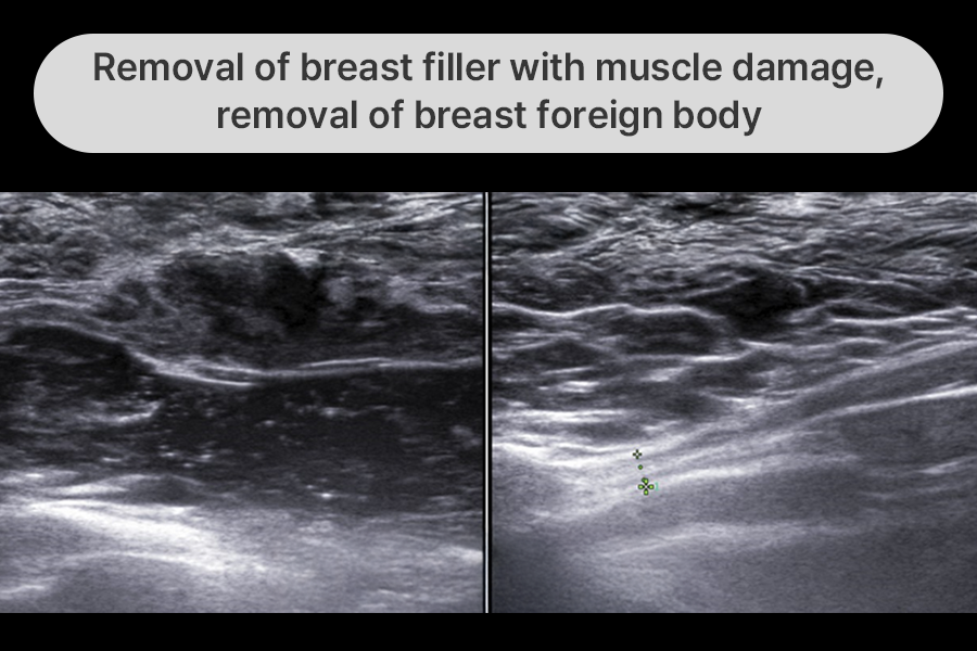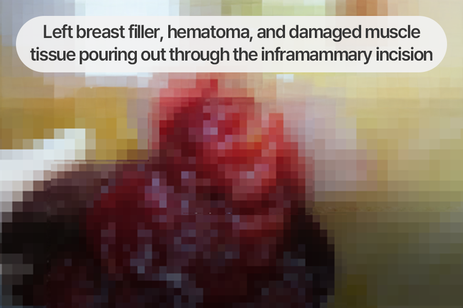 We removed the breast filler along with damaged tissue, hematoma, and torn muscle tissue.
