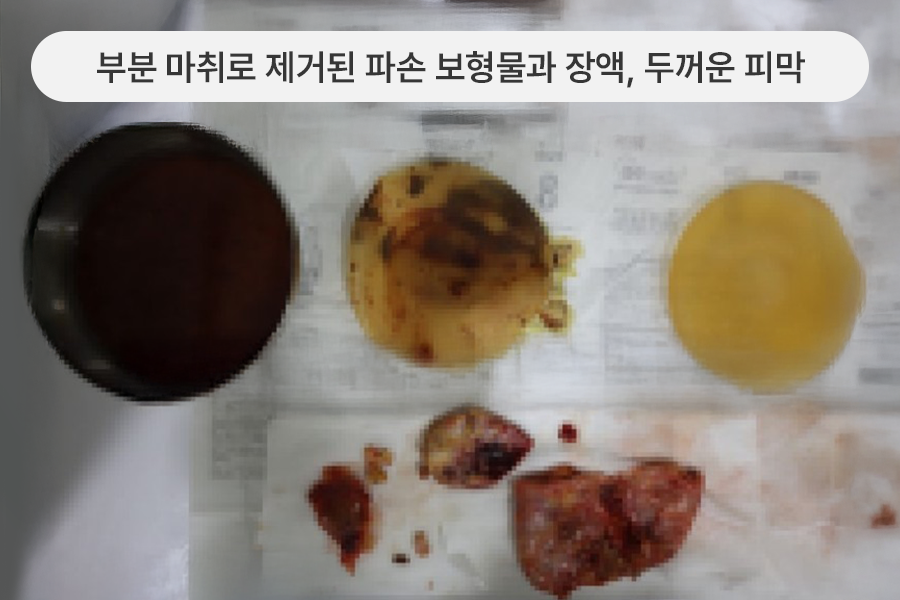 손상이 심한 상태로, 부분마취 하에 보형물과 피막,
