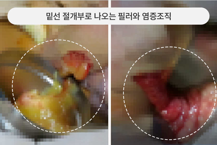 엉덩이 · 골반 필러가 사타구니로 흐르고 염증이 생긴 상태