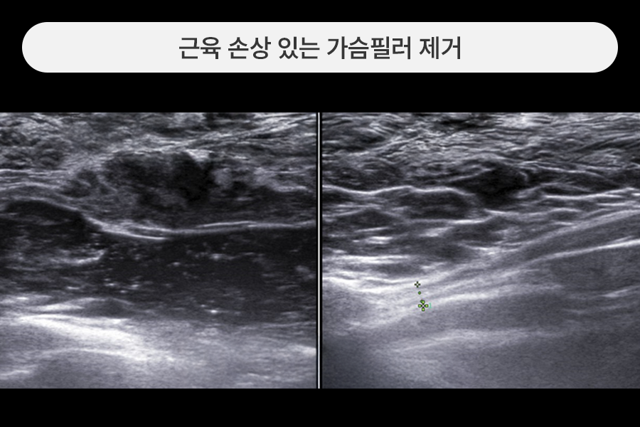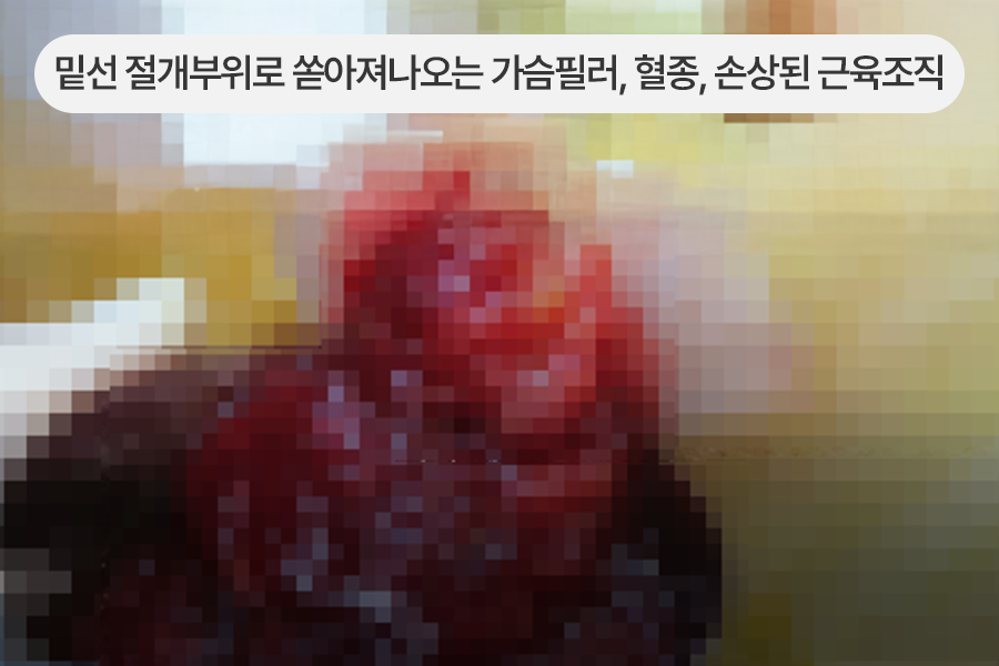 가슴필러 제거와 손상조직, 혈종, 찢어진 근육조직을 제거하였습니다.