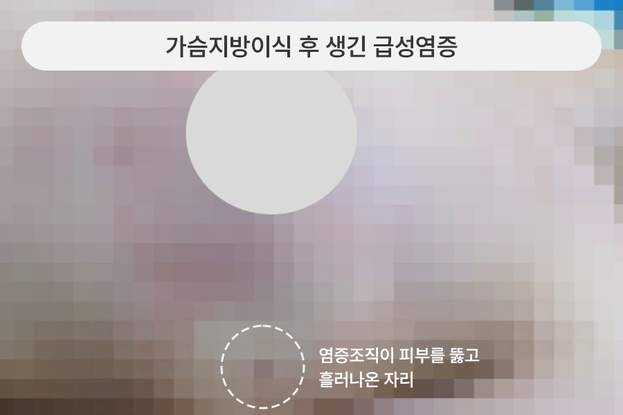 가슴지방이식 후 생긴 급성염증으로 고름이 피부를 뚫고 밖으로 흘러나온 상태였습니다.