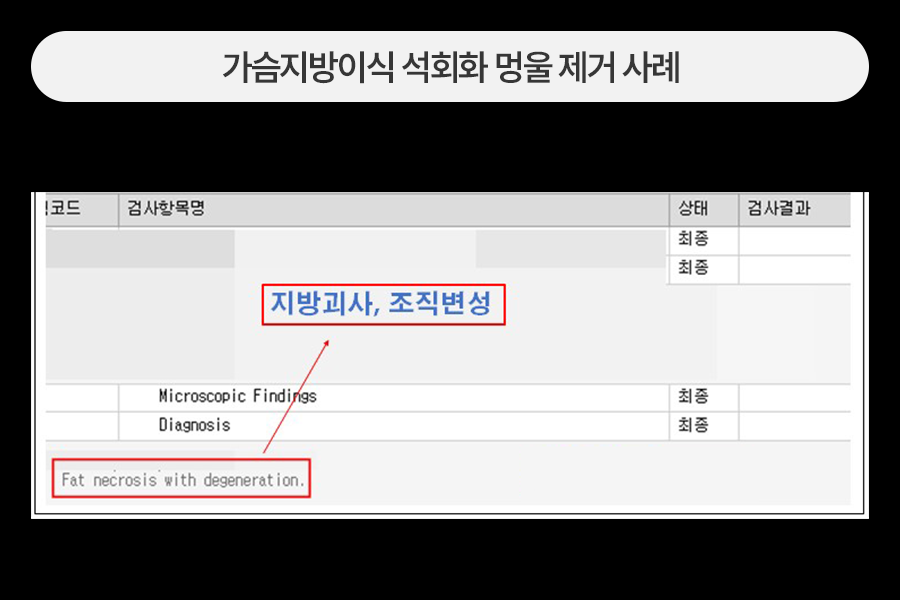 4~5cm 사이즈의 큰 석회화 멍울이 관찰되었습니다.